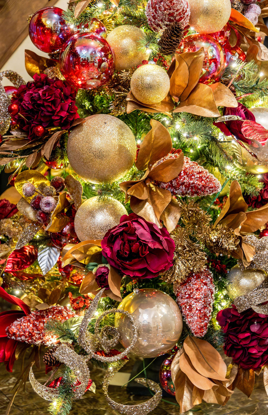 red and gold tabletop Christmas tree pre-decorated with ornaments, flowers, and more