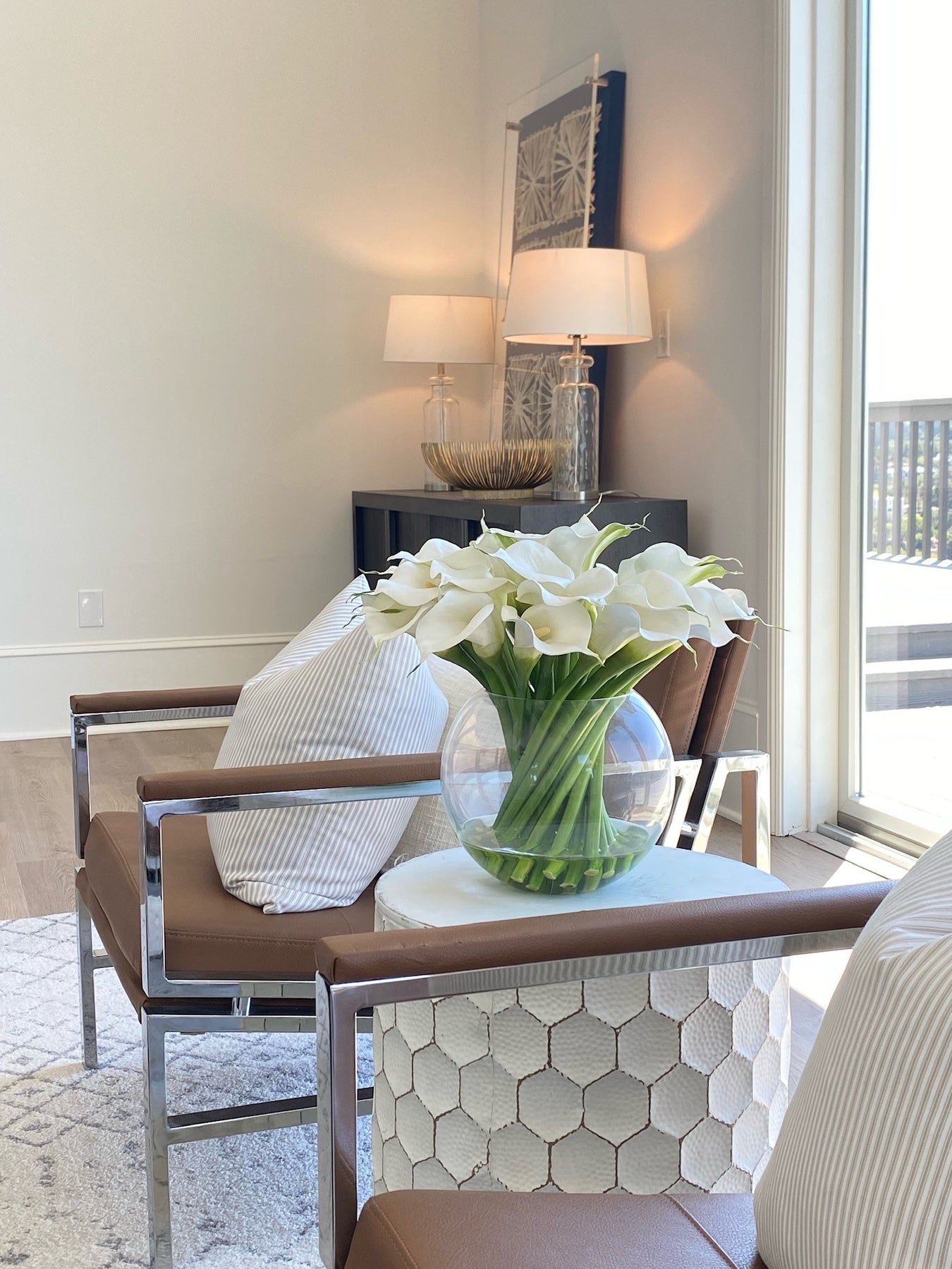 This elegant and contemporary design is infused with Winward's signature calla lily. Arranged in a beautiful round glass vase, it looks stunning in your kitchen or as the centerpiece on your dining room table. Exploding with beauty, our calla lily home décor adds a touch of grace and brightness to your home that can€™t be replicated.