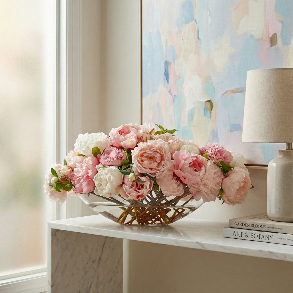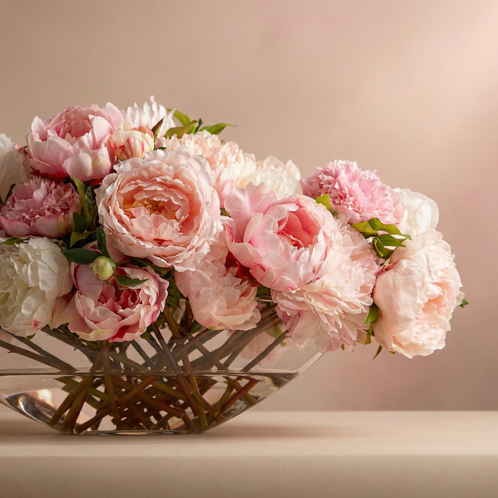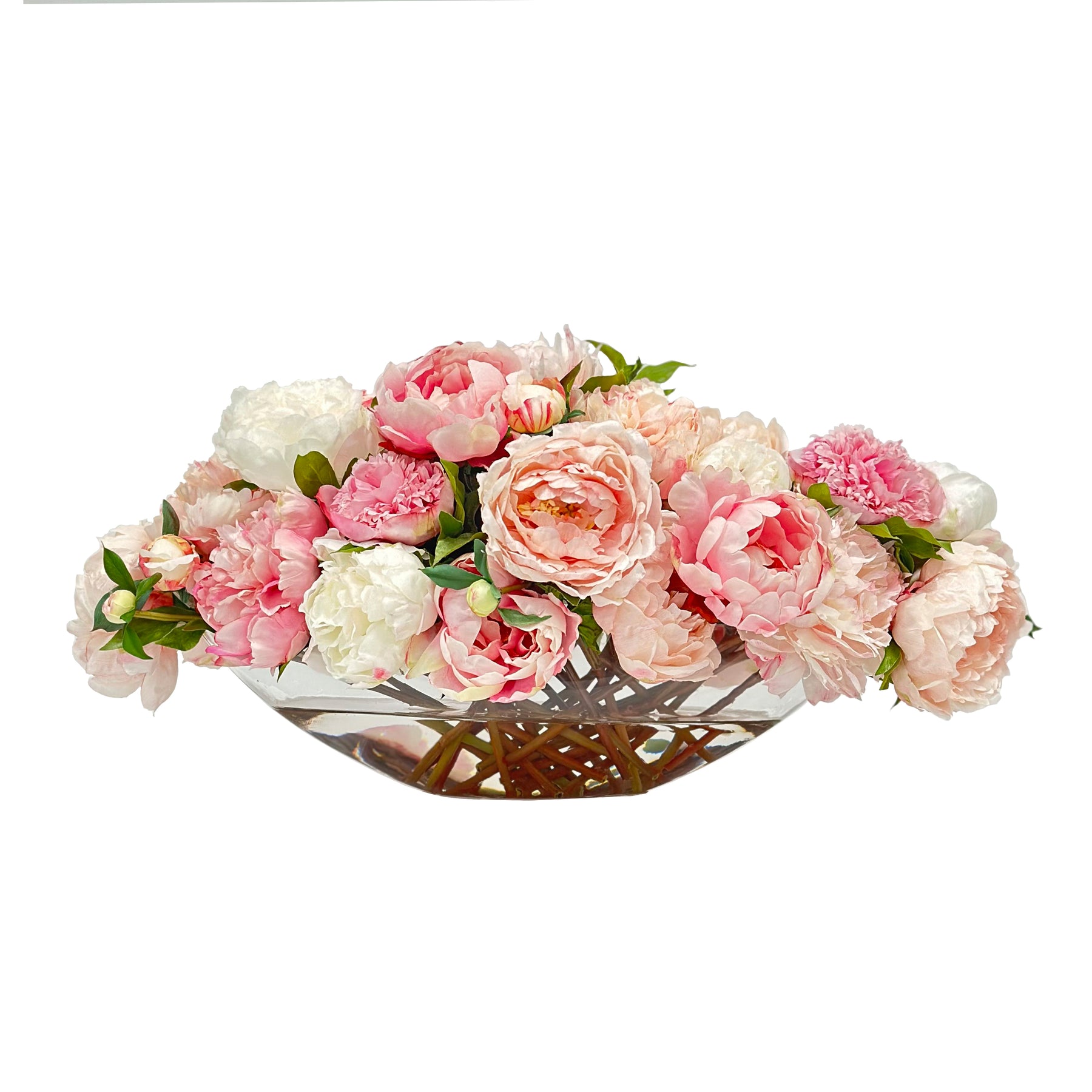 A peony paradise, this Spring-favorite flower is arranged in sheer abundance paired with our oval-shaped glass vase. Designed to sit low, it serves as the perfect dining centerpiece for long tables or the buffet.