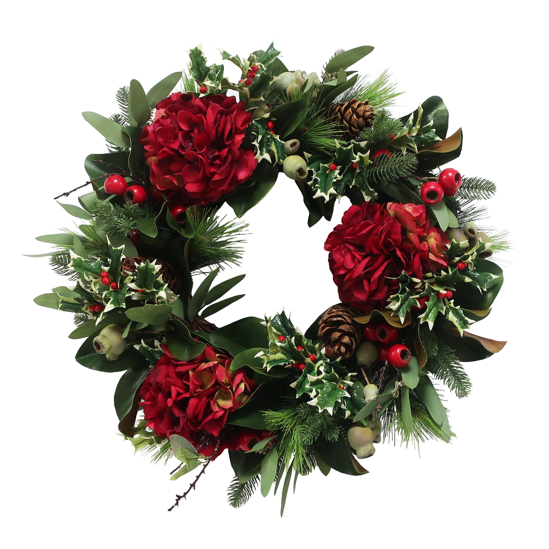 Hand-crafted wreath with red hydrangea blooms and green foliage for festive display against white background